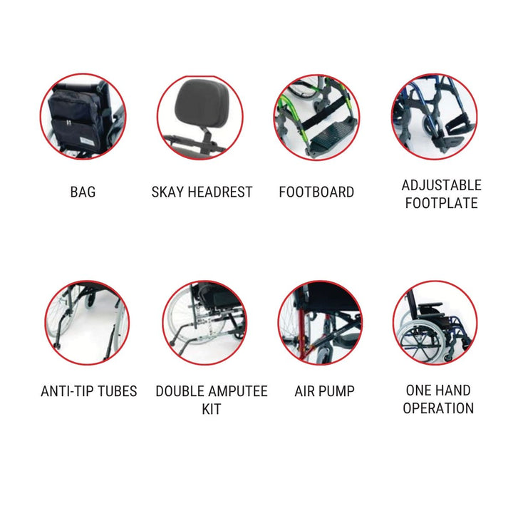 Headrest, adjustable footboard/footplate, anti-tip tubes, amputee kit, air pump, IV pole, crutch holder, drum brakes, belt |