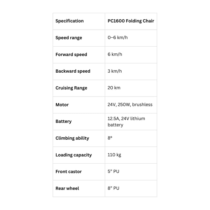 The PC1601 Foldable Power Wheelchair is in stock now and available for delivery across Dubai, Abu Dhabi, and throughout UAE.